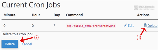 1. Under Current Cron Jobs, locate your cronjob and click on Delete.