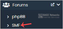 4. On the left side, locate the Forums category. Click on it and then on the SMF link that appears.