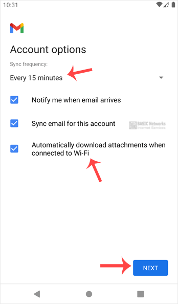 7. You can select Email Sync Frequency and other options under the accounts option. Choose as per your needs and press Next.