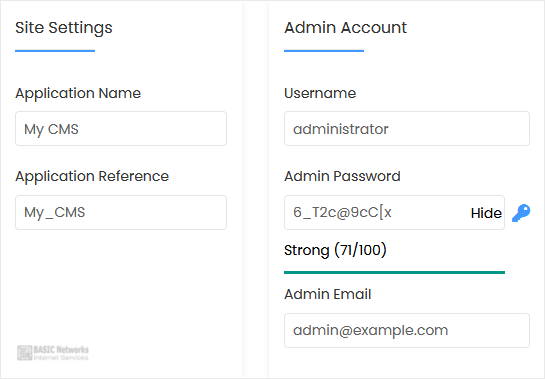 • Admin Username: Your new PyroCMS username (for security reasons, do not use the administrator or the admin username).